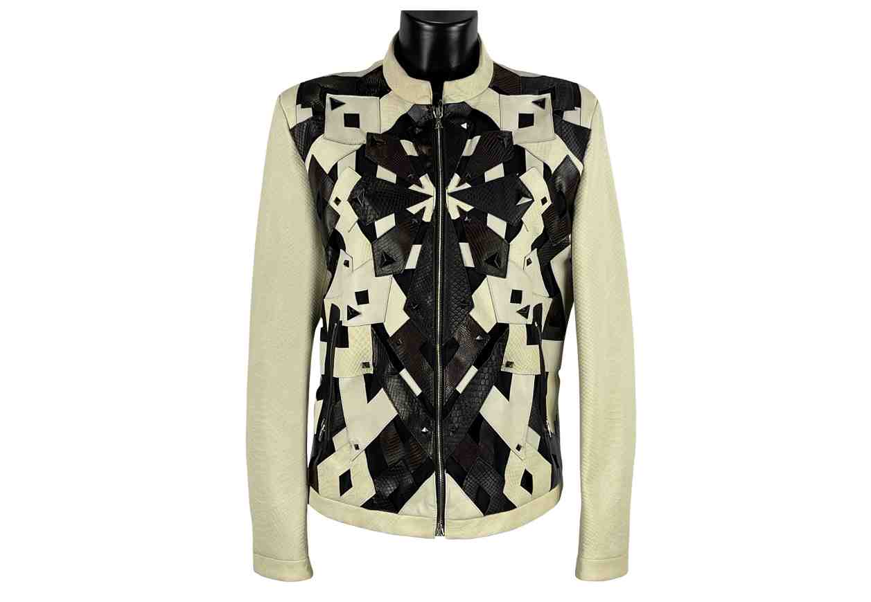 Biker unisex in 85% pelle di ovino, 15% pitone, fodera in 56% seta.