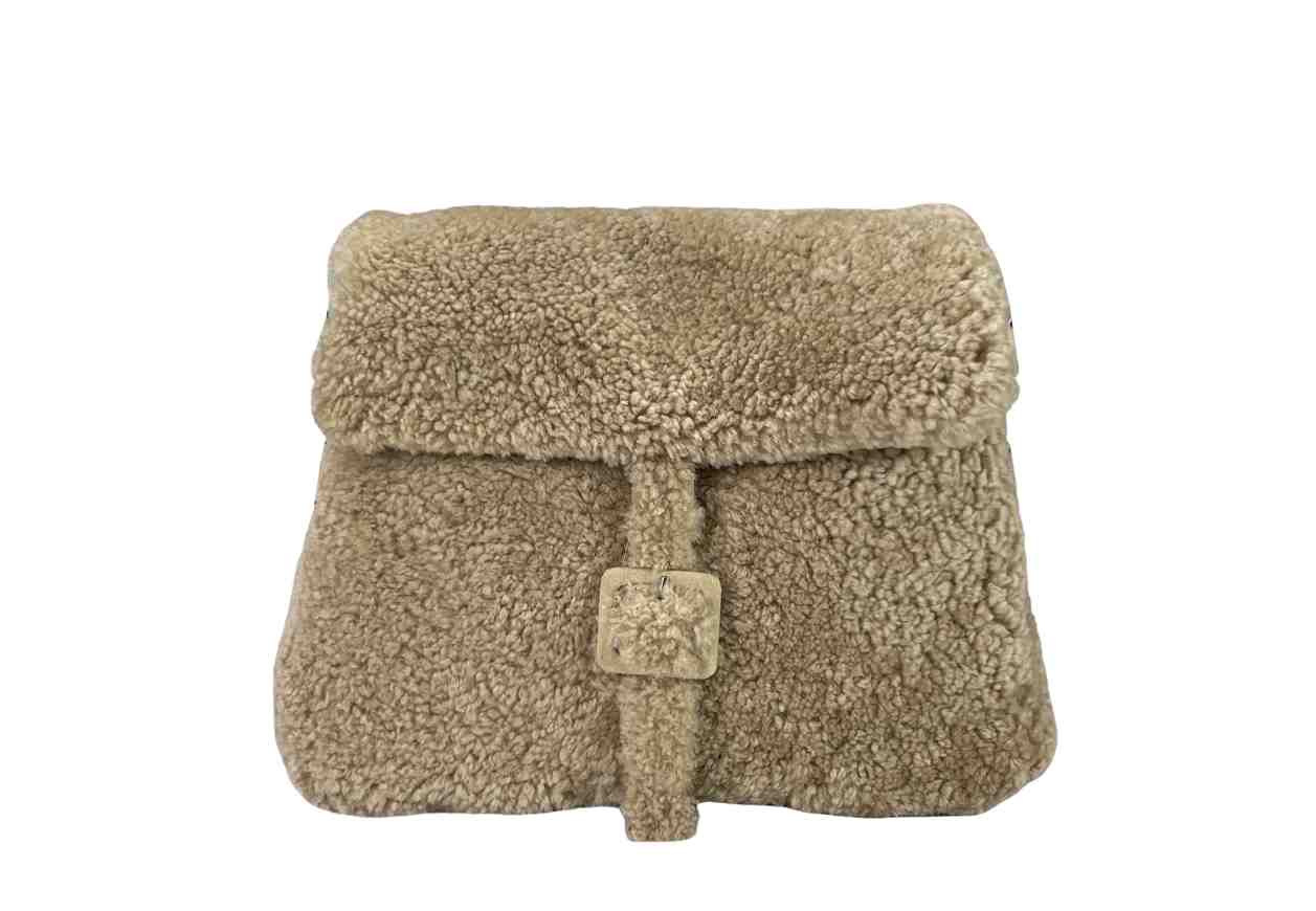 Borsa in 100% ovino merinos con fodera in pelle e tasche , tracolla metallica e chiusura a patta.