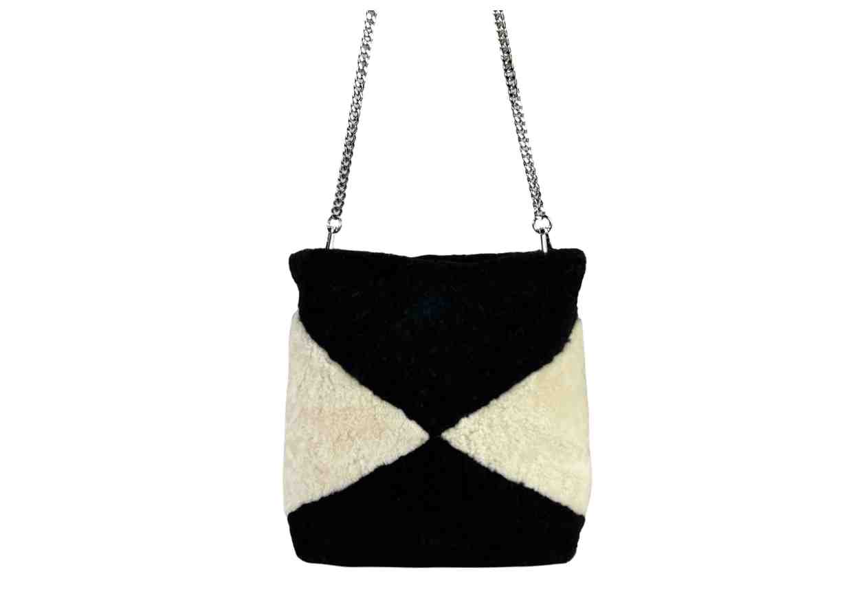 Borsa in 100% montone bicolor, con tracolla metallica.