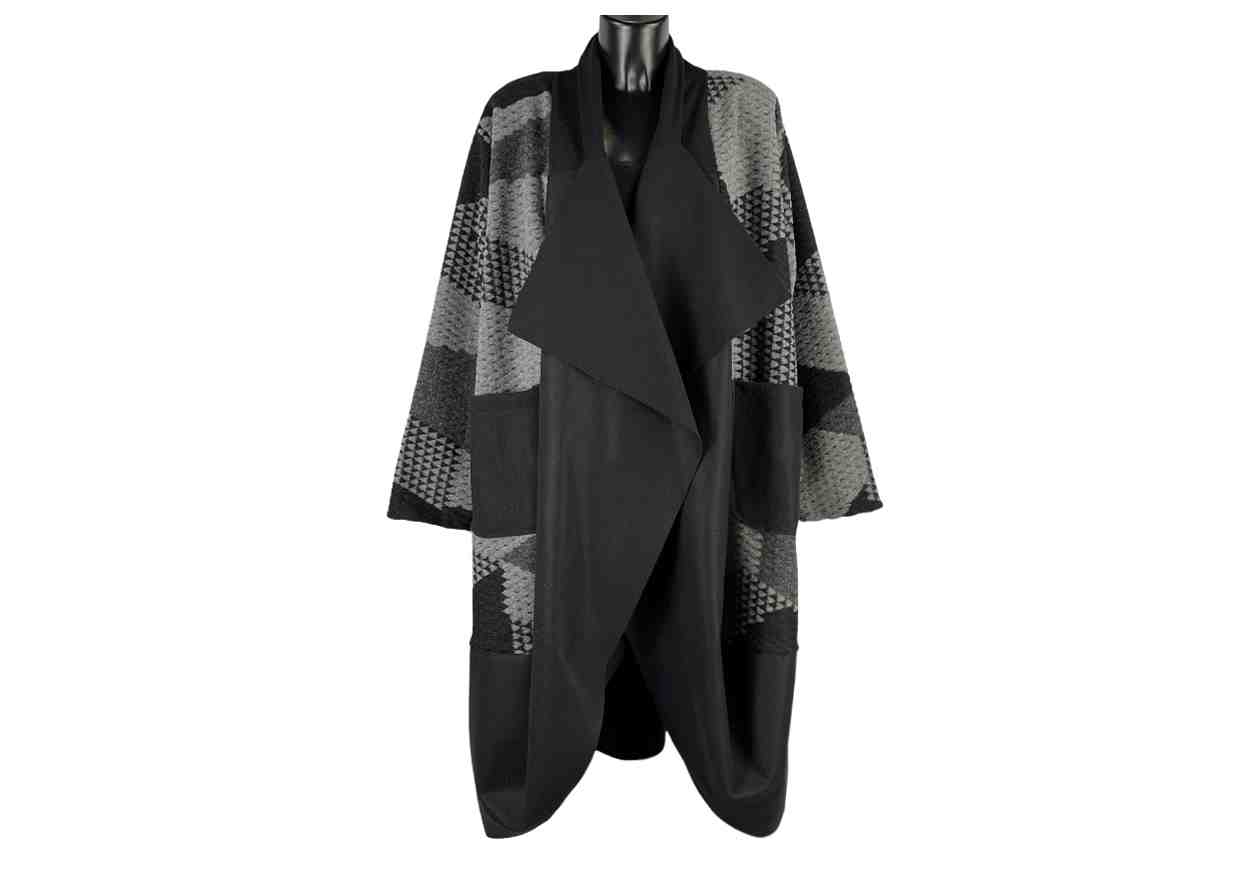 BUTTERFLY Cardigan lungo in misto lana in fantasia geometrica, tasche e collo a scialle.