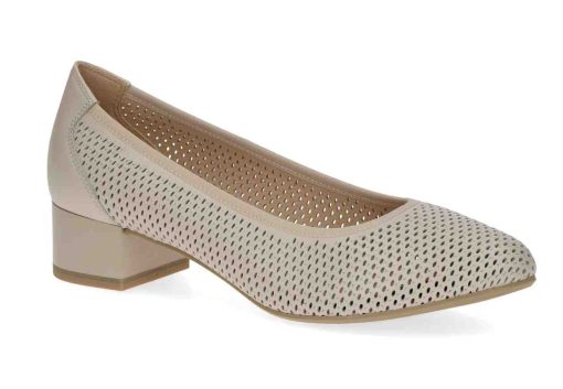 Eleganza e freschezza si uniscono in questa décolleté in pelle, caratterizzata da una lavorazione traforata che assicura traspirabilità e leggerezza. Il tacco basso a blocco offre una calzata stabile e confortevole, rendendola perfetta per l’uso quotidiano e le mezze stagioni. Il design essenziale la rende facile da abbinare sia con outfit formali che casual chic.
