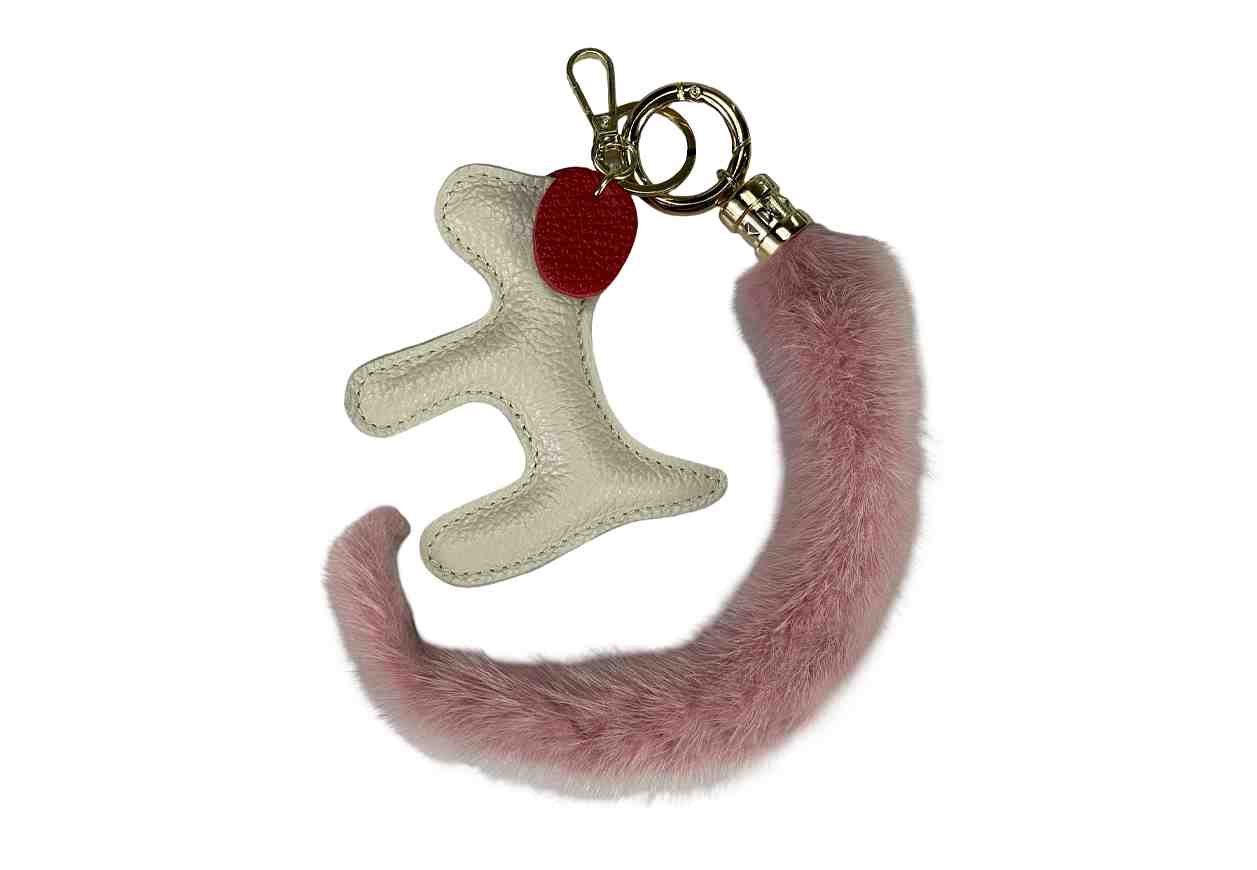Charm a forma di cane in pelle di vitello con coda di pelliccia di visone e due moschettoni