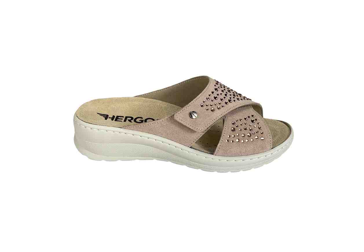 Descrizione prodotto:HERGOS Ciabatta scamosciata con strass e velcro regolabile.