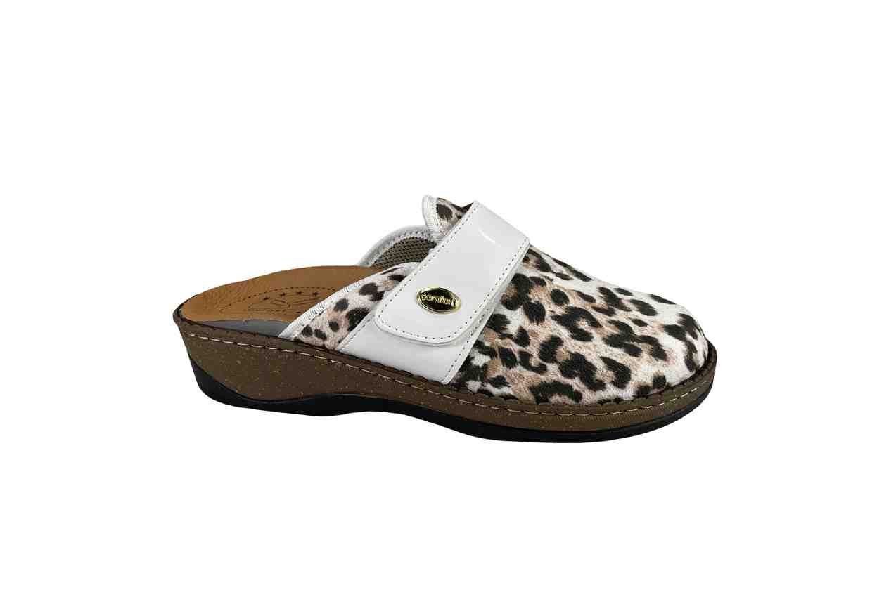 Descrizione prodotto:COMFORT RELAX Ciabatta in fantasia leopardata con velcro, tacco a zeppa.
