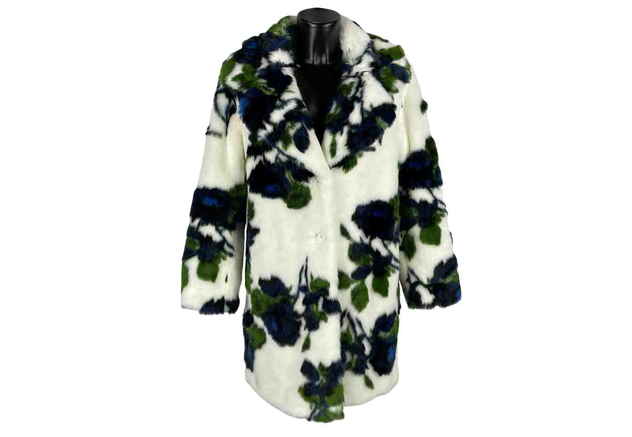Ecopelliccia in 74% modacrilico, 18% poliestere, 8% acrilico, bottoni e tasche.