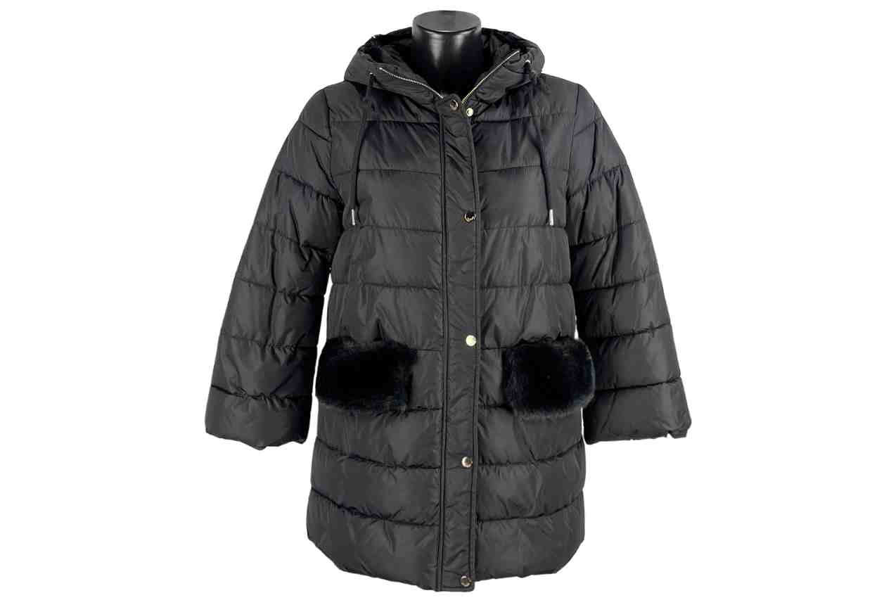 Giubbino donna in 100% poliammide con full zip, tasche, cappuccio ed ecopelliccia interna.