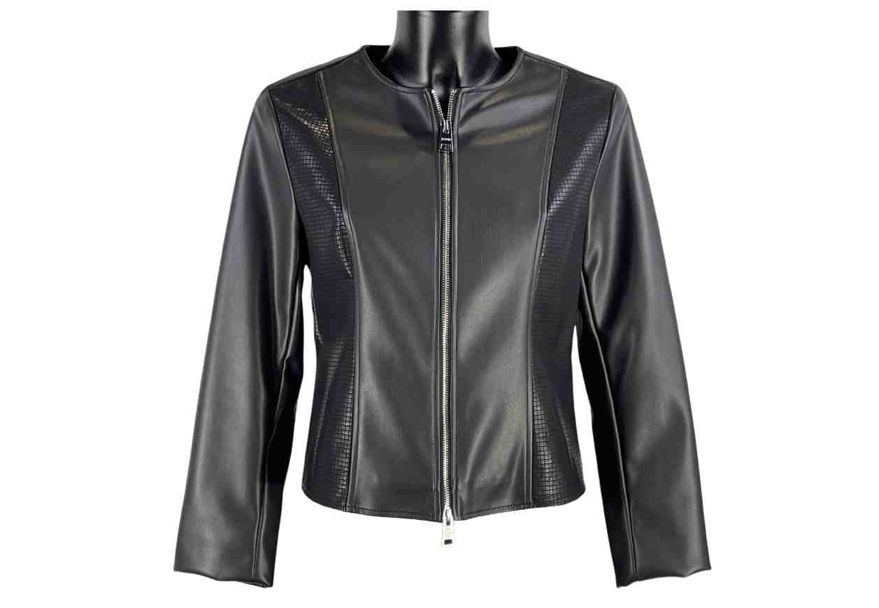 Giubbino in ecopelle collo coreana e lavorazione laterale. Full zip. NO TASCHE PRESENTI.