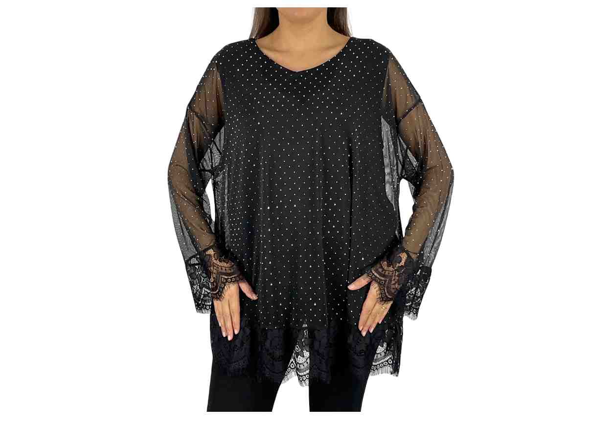 GRETA GARBO Maglia in tulle con strass, pizzo sul fondo e fodera interna.