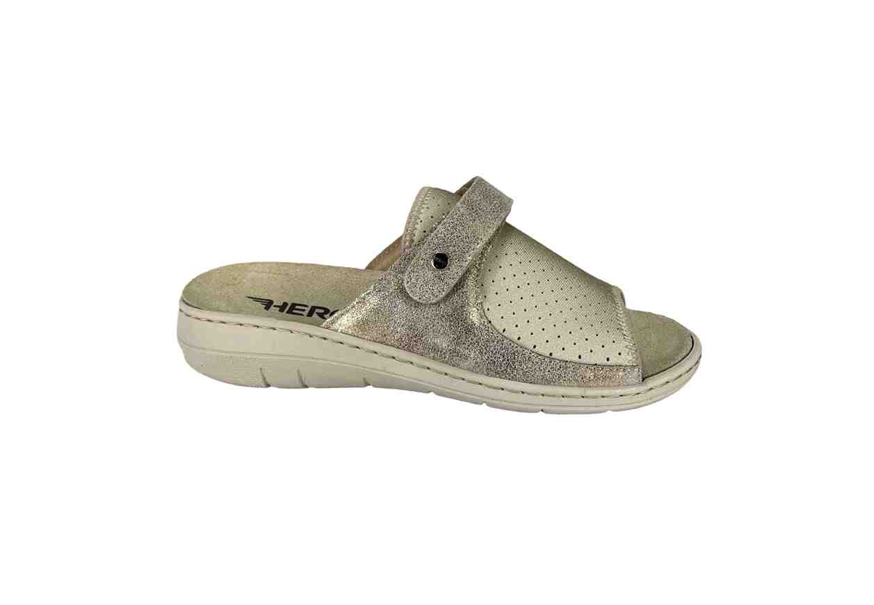 Descrizione prodotto:HERGOS Ciabatta in ecopelle con velcro e fascia in tessuto traforato, tacco a zeppa.