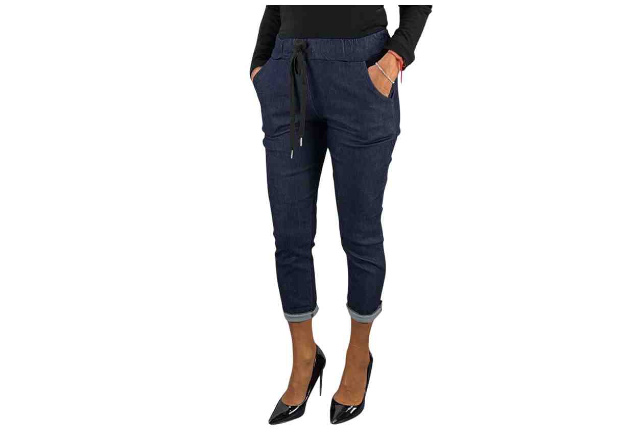 PINK LOVE Pantalone effetto jeans con elastico in vita e coulisse.