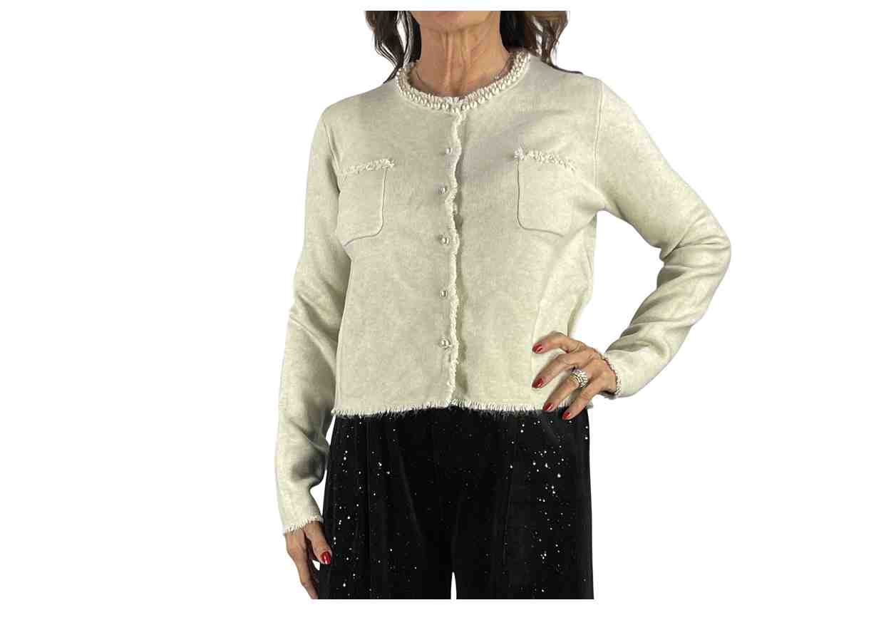 PINKLOVE Cardigan in tinta unita con perline e frangette.