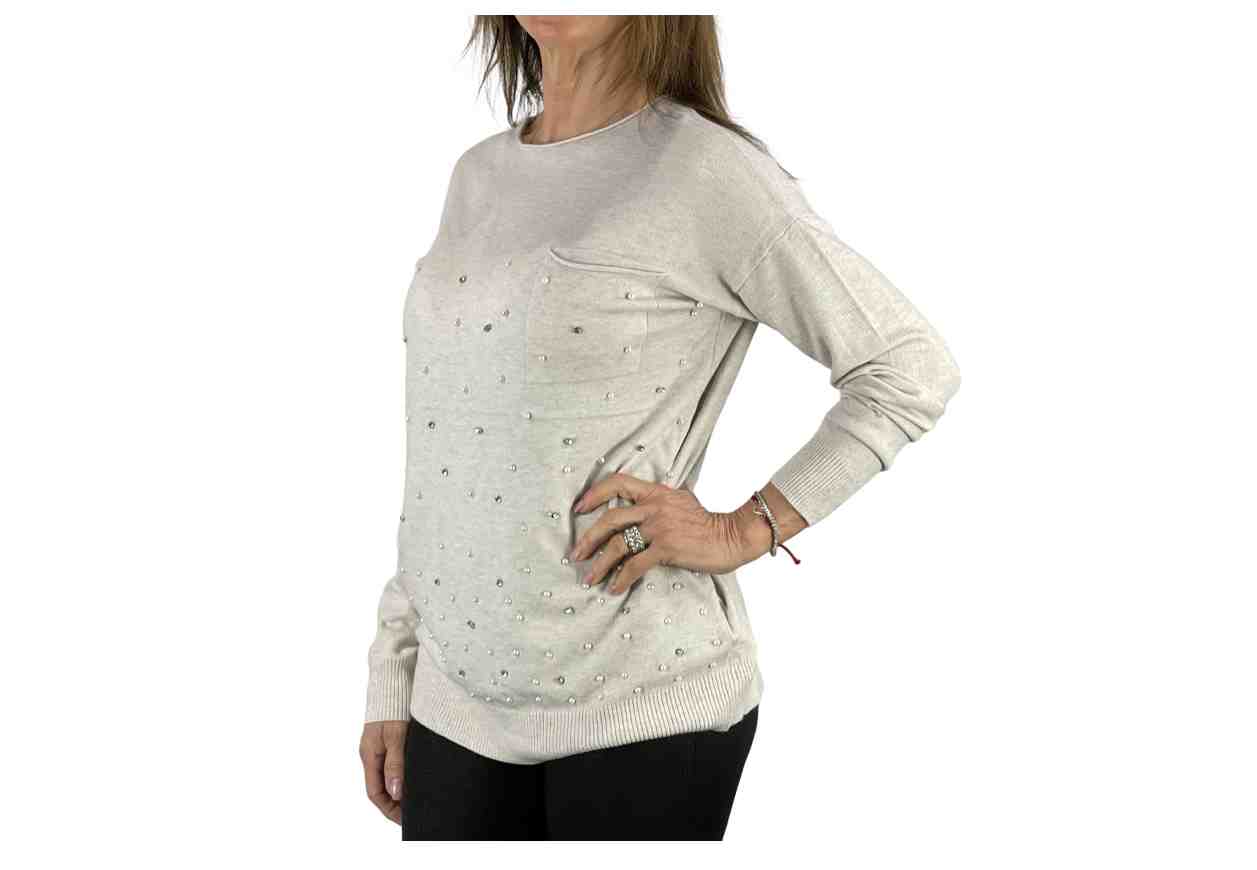 PINKLOVE Maglia in tinta unita con perline e strass, taschino.
