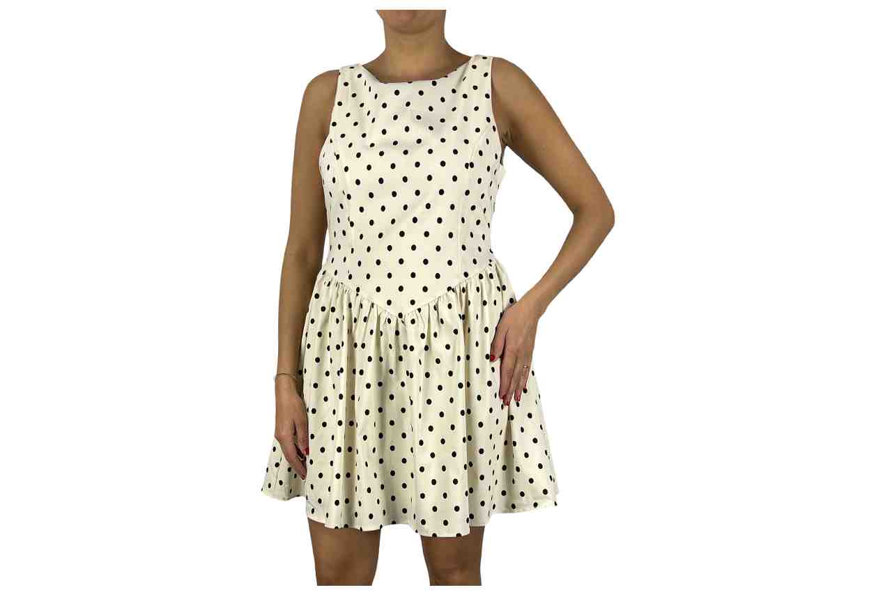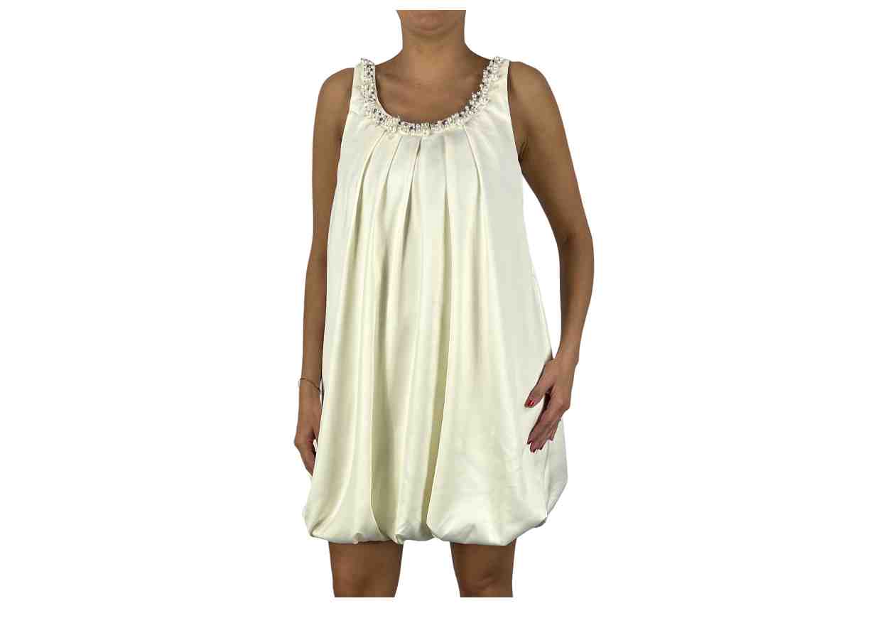 Abito smanicato in simil raso tinta unita con fodera interna, gonna effetto baloon e applicazioni gioiello.