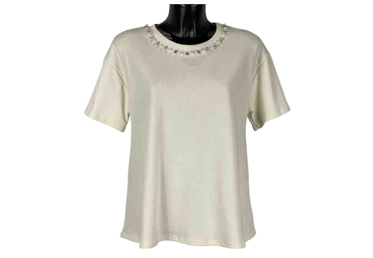PL Maglia in tinta unita con perline e strass su girocollo.