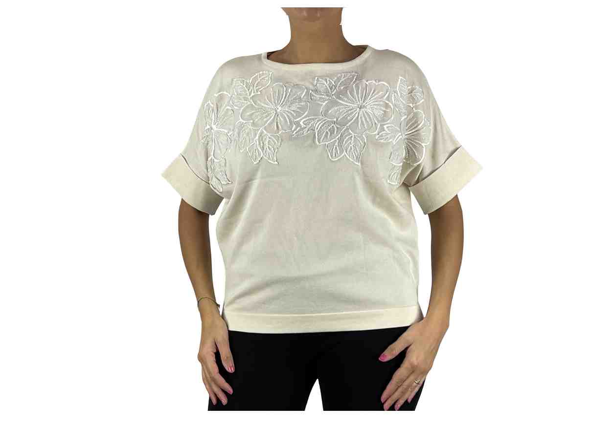 PL Maglia in tinta unita, inserto floreale con perline, manica corta.