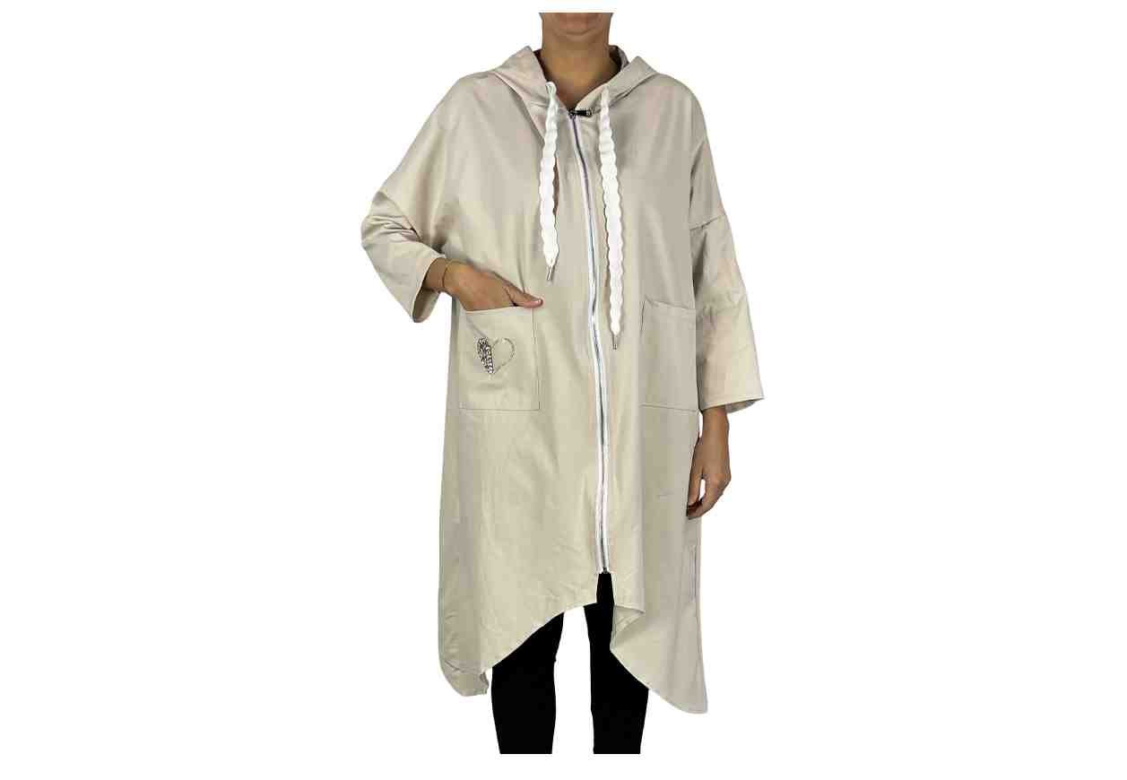 RENE' BORDEN Giacca lunga con cuore in strass su tasca frontale, zip e cappuccio.