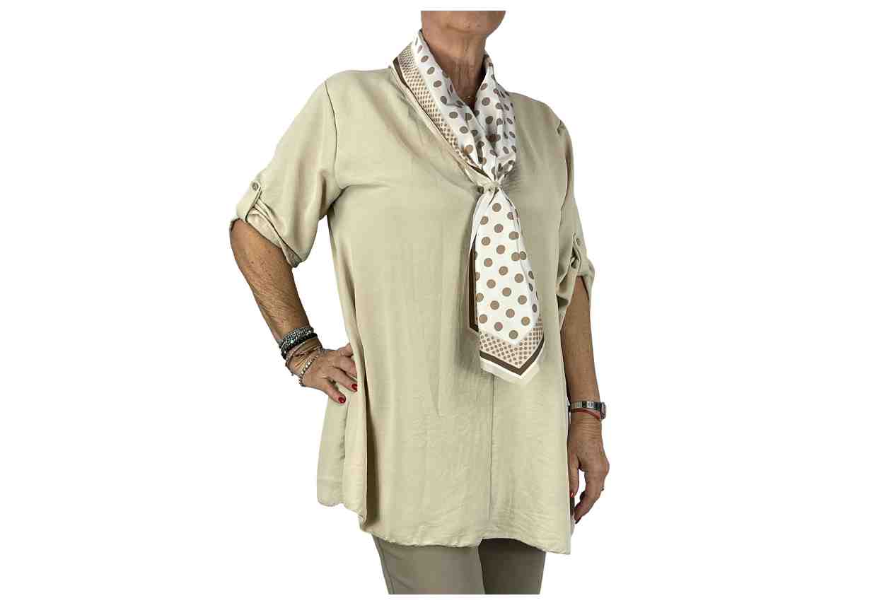 RB Maglia in tinta unita con "cravattina" in fantasia, maniche regolabili.