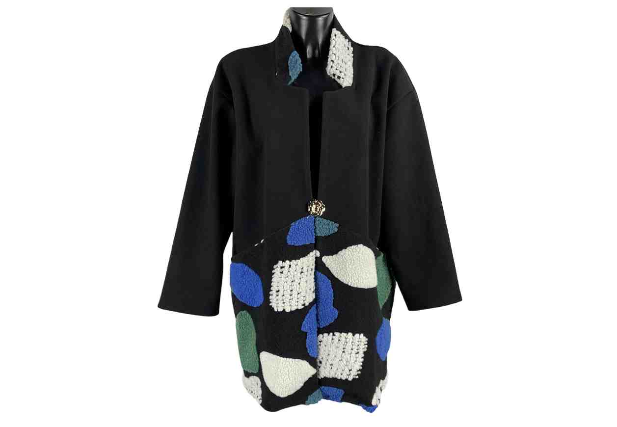 RENE’ BORDEN Cappotto con inserti colorati teddy con spilla a fiore, tasche frontali.