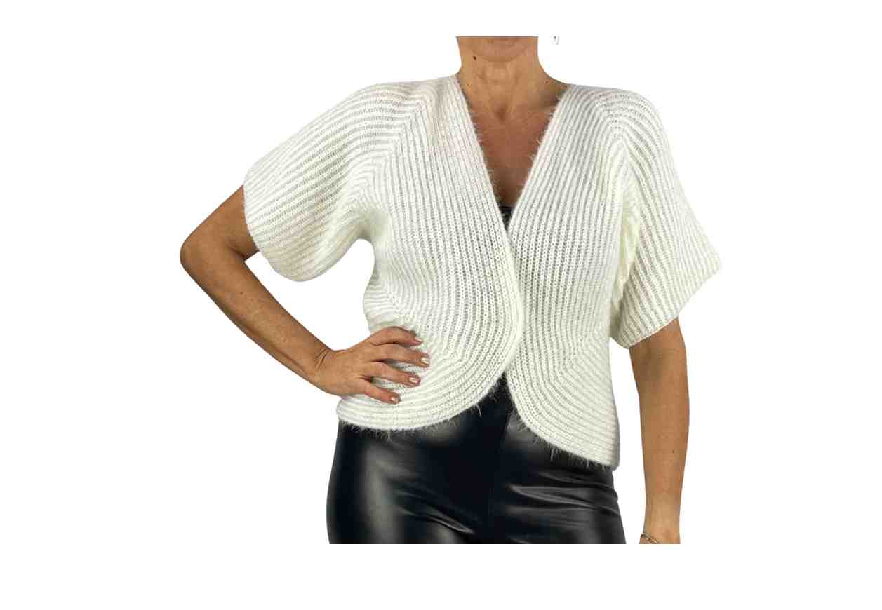 RENE' BORDEN Cardigan corto, effetto 'peluche' in tinta unita, lavorazione a costine e maniche corte.