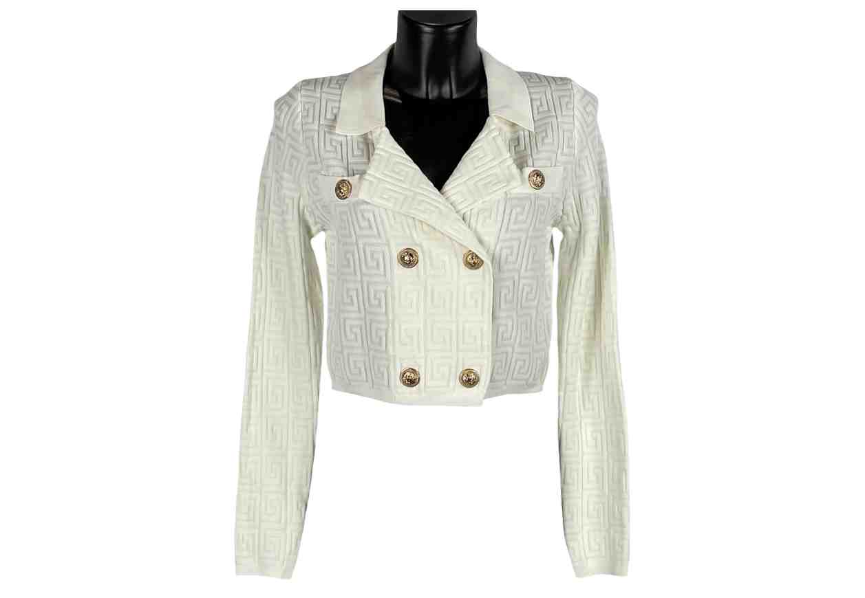 VR Cardigan corto in fantasia chiave greca, collo rever e bottoni dorati.