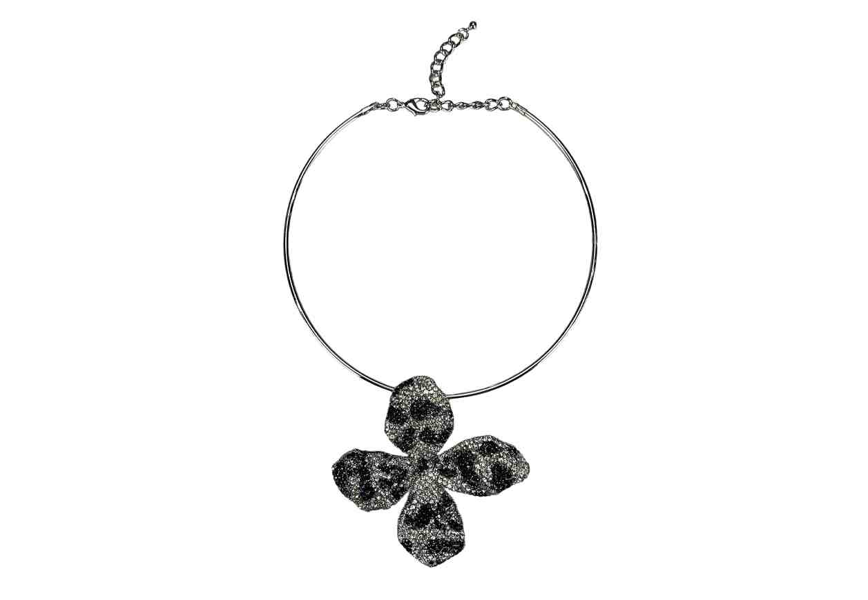 VR Collana rigida con fiore e strass in dettaglio.